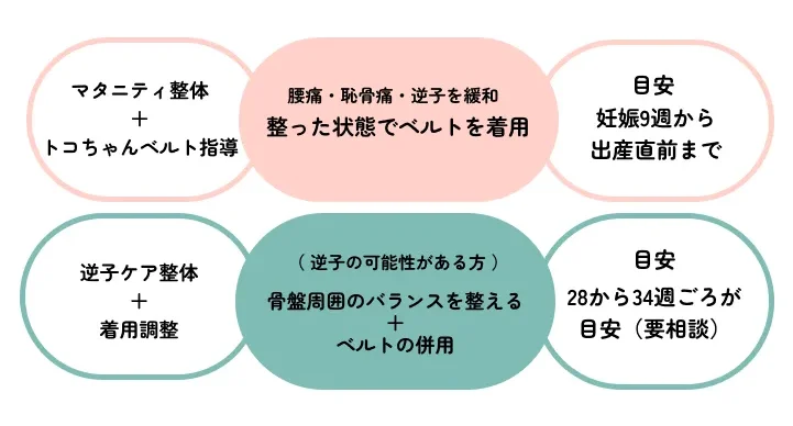 | 逆子ケア整体(希望者)+着用調整 | 逆子の可能性がある方に対し、骨盤周囲のバランスを整える+ベルトの併用提案 | 28~34週頃が目安(要相談) |
