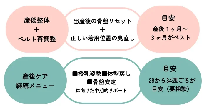 | 産後整体+ベルト再調整 | 出産後の骨盤リセットを目的にした整体と、育児中の正しい着用位置の見直し | 産後1ヶ月~3ヶ月頃がベスト |