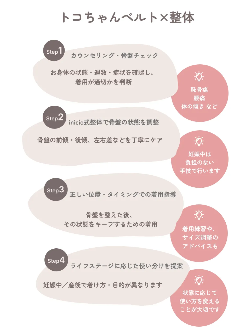 inicioでは、トコちゃんベルトをただ「販売」するのではなく、ライフステージに寄り添った骨盤ケアの一環として、整体との併用や正しい着用方法のサポートを行っています。